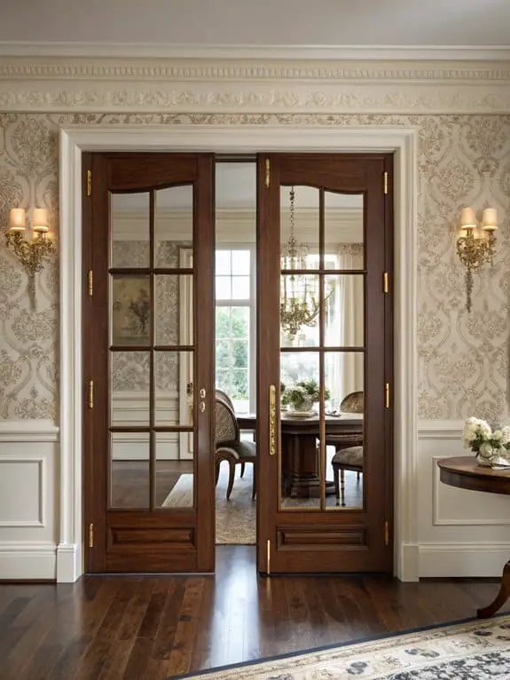 Their divided glass panes let in natural light, making your space feel open and bright. Mirrored French doors can even reflect light, further enhancing the perception of room size. Pair them with soft white curtains or even DIY window decals for privacy.
